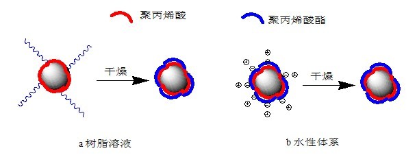 HT A20分子中的錨固部分由(甲基)丙烯酸、磷酸的均聚物或共聚物組成,通過和鈦白粉間的吸引力(配位作用、共價鍵)吸附在粒子表面,將粒子隔離開來。和樹脂相容的穩定部分由丙烯酸酯、甲氧基聚丙二醇丙烯酸酯無規共聚物組成,賦予表面改性后的鈦白粉粒子良好的再分散性,并且能穩定均勻分散在樹脂溶液和溶劑揮發后的樹脂中。在體系干燥過程中以及干燥后,和樹脂相容的部分能包覆在鈦白粉粒子表面,防止粒子聚集,使得鈦白粉粒子在樹脂中能均勻分散。圖2表示改性劑HT A20處理鈦白粉粒子后,HT A20在粒子表面的形態。圖2a表示在樹脂溶液或溶劑中,干燥前,改性劑的錨固部分和鈦白粉粒子間通過共價鍵、配位鍵結合在粒子表面上,聚丙烯酸酯部分充分伸展,通過空間位阻作用穩定粒子;干燥后,聚丙烯酸酯部分包覆在粒子上或和樹脂基體互相滲透。圖2b表示在水性體系中,干燥前,改性劑的聚丙烯酸錨固部分和鈦白粉粒子間通過共價鍵、配位鍵結合在粒子表面上,依靠靜電斥力穩定粒子;干燥后,聚丙烯酸酯部分包覆在粒子上或和樹脂互相滲透??梢?,雙親型嵌段聚合物改性劑HT A20對鈦白粉進行有機表面處理后,在有機溶劑體系和水性體系中,都能提高鈦白粉在介質中的分散穩定性并改善鈦白粉和樹脂的相容性。